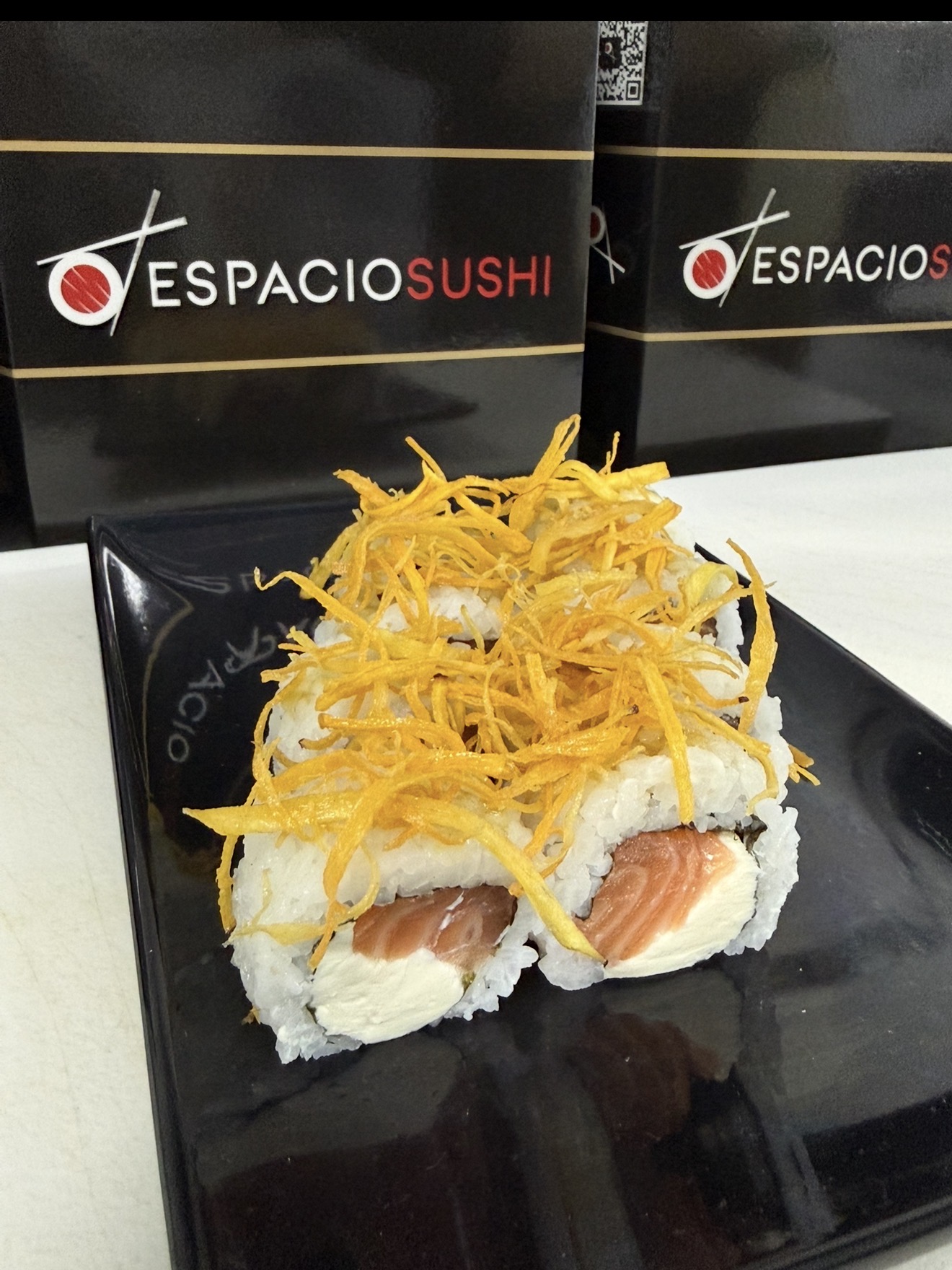 Roll relleno de salmón y queso, cubierto por una salsa de mostaza y miel con delicados hilos de batata frita
